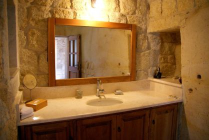This street-level house has two bedrooms: One has beautiful stone lancet arches of tawny stone; the other is carved right from the rock—a real cave. Both have king beds and all comforts. An extra sofa bed is possible into one of the bedrooms. The cave bathroom is fully modern, with a wide vanity and walk-in shower. When it’s time for sun, sit in the spacious courtyard for coffee, meals or cocktails. The kitchen is fully equipped for cooking meals.