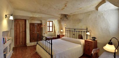 Several couples or family & friends will enjoy the space, the cave-&-stone-house ambience, the modern conveniences, the cool & quiet. The golden volcanic tufa, with traditional stonework details, surrounds you. Windows let light into every room, some with fine views. Niches & closets carved into the cave walls provide storage for clothes, books and travel stuff. All of its rooms may be entered via a private corridor/ hallway, but they have separate outside entrances as well.
